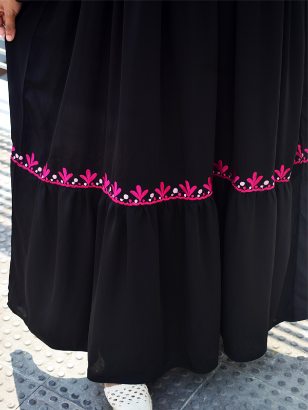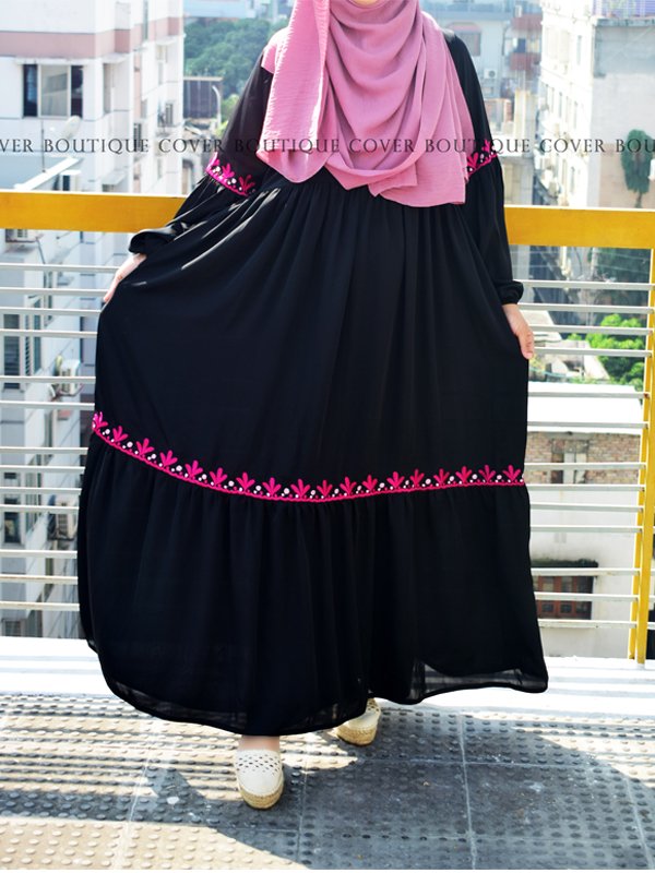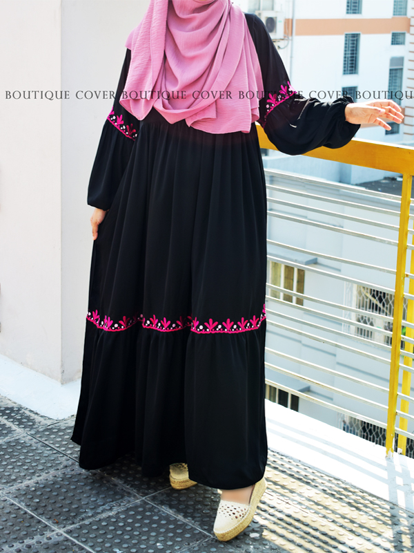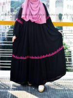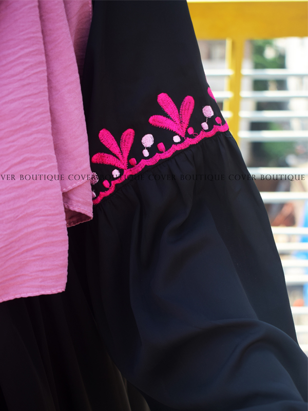 Raisa Gown has Lantern sleeves. Embroidery in sleeves and at the bottom. Has hidden zipper for breastfeeding. Has wudu friendly elastic sleeves. Material is cherry.